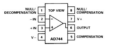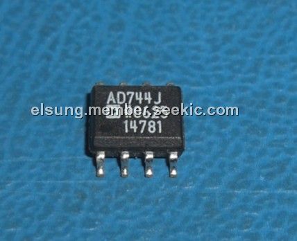 The AD744JR is a fast-settling, precision, FET input, monolithic operational amplifier. The AD744JR offers the option of using custom compensation to achieve exceptional capacitive load drive capability. It is internally compensated for stable operation as a unity gain inverter or as a noninverting amplifier with a gain of two or greater. External compensation may be applied to the AD744JR for stable operation as a unity gain follower. External compensation also allows the AD744JR to drive 1000 pF capacitive loads, slewing at 10 V/μs with full stability. The applications of the device inlcude Output Buffers for 12-Bit, 14-Bit and 16-Bit DACs, ADC Buffers, Cable Drivers, Wideband Preamplifiers and Active Filters.