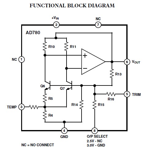 AD780ARZ absolute maximum ratings: (1)VIN to Ground: 36 V; (2)Trim Pin to Ground: 36 V; (3)Temp Pin to Ground: 36 V; (4)Power Dissipation (25℃): 500 mW; (5)Storage Temperature: –65℃ to +150℃; (6)Lead Temperature (Soldering, 10 sec): 300℃; (7)Output Protection: Output safe for indefinite short to ground and momentary short to VIN; (8)ESD Classification: Class 1 (1000 V).