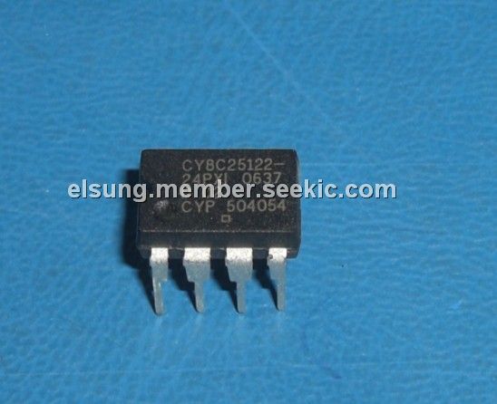 CY8C25122-24PXI features: (1)Operating Frequency: 93.7kHz - 24MHz; (2)Operating Voltage: 3.0 - 5.25V; (3)Program Memory (KBytes): 4; (4)Data Memory (Bytes): 256; (5)Digital PSoC Blocks: 8; (6)Analog PSoC Blocks: 12; (7)I/O Pins: 6; (8)External Switch Mode Pump: No; (9)Available Packages: 8 PDIP.