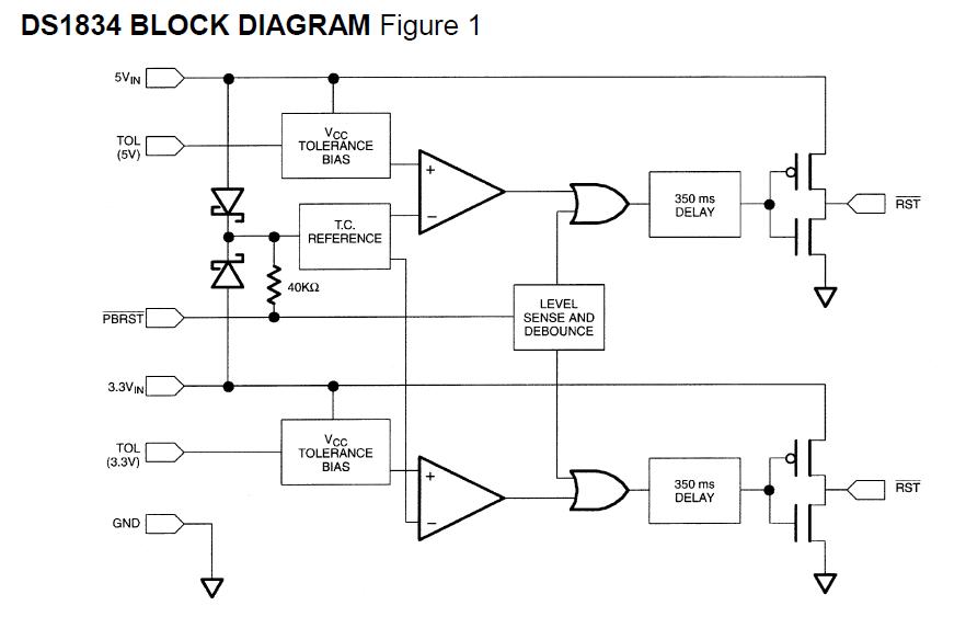 The DS1834A is a Dual EconoResets monitor. The three vital system conditions of it are 5-volt supply, 3.3volt supply, and an external override. Lastly, the DS1834A supports an external reset via an internally debounced pushbutton input. When the pushbutton is pulled low both resets will be asserted for approximately 350 ms after the pushbutton is released.
