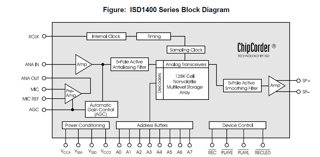 The ISD1420P is a single-chip voice record/play back device. It provides high-quality, single-chip record/playback solutions to short-duration mesaging applications. The ISD1420P CMOS device includes an onchip oscillator, microphone preamplifier, automatic gain control, antialiasing filter, smoothing fliter, and speaker amplifier. A minimum record/playback system of the ISD1420P can be confligured with a microphone, a speraker, several passives, two push buttons, and a power source. Recording are stored in on-chip nonvolatile memory cells, providing zero-power message storage. This unique, singel-chip solution is made possible through patented multilievel storage technology. Voice and audio signals of the ISD1420P are stored directly into memory in their natural form, providing high-quality, solid-state voice reproduction.