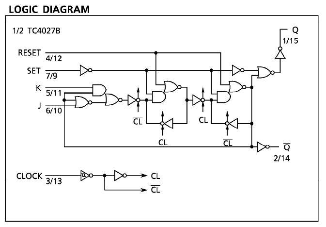The TC4027BF is a J-K master-slave flip-flop having RESET and SET functions. In the case of J-K made, when the clock input is given with both RESET and SET at "L", the output changes at rising edge of the clock according to the states of J and K. When SET input is placed at "H", and RESET input is placed at "L", outputs become Q = "H", and Q = "L". When RESET input of TC4027BF is placed at "H", and SET input is placed at "L", outputs become Q = "L", and Q = "H". When both of RESET input and SET input are at "H", outputs become Q = "H" and Q = "H".
