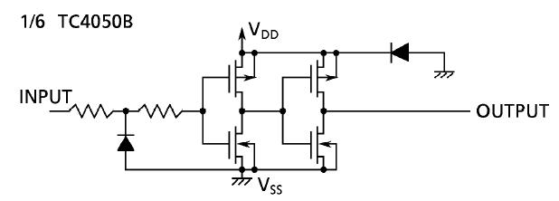The TC4050BF is a hex buffer/converter, which contains six circuits of buffers. The TC4050BF is non-interver type. Since one TTL or DTL can be directly driven having large output current, these are useful for interfacing from CMOS to TTL or DTL. As voltage up to VSS+18 Volts can be applied to the input regardless of VDD, these can be also used as the level converter IC’s which converts CMOS logical circuits of 5 volts system. Ideal switching characeristic has been obtained by the circuit diagram of two stage inverters for TC4050BF.